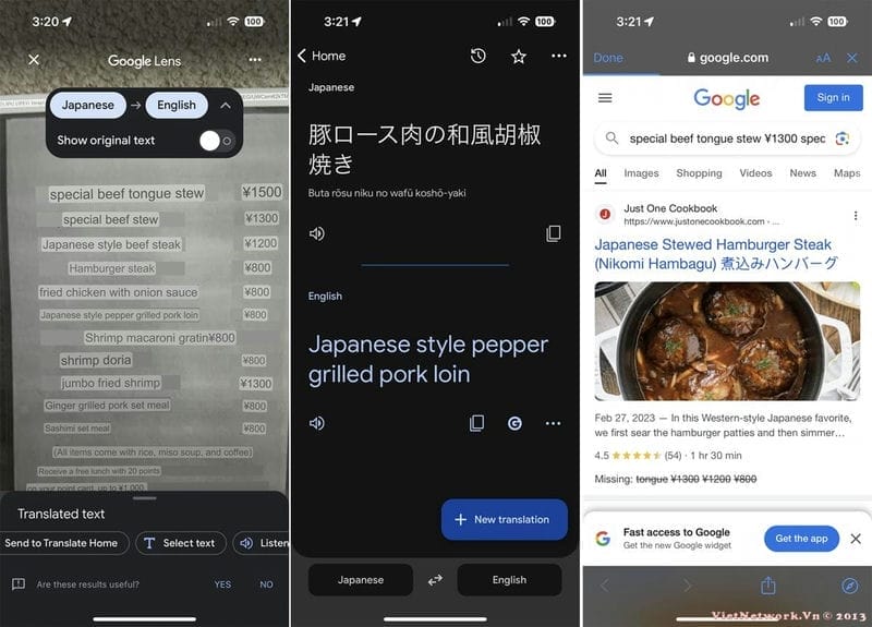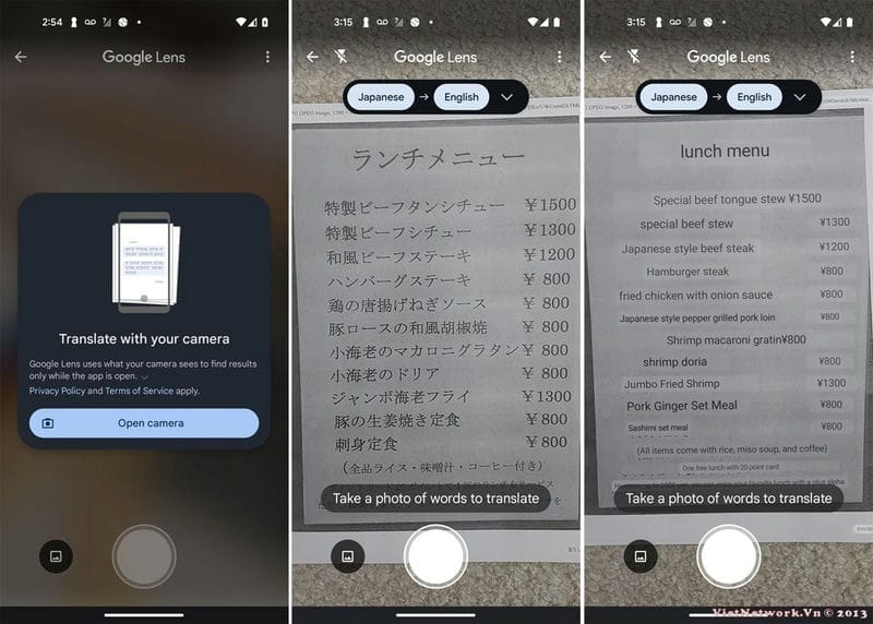 Hướng máy ảnh của thiết bị vào biển hiệu, menu hoặc tài liệu bạn cần dịch. Sau khi ứng dụng có thời gian nhận dạng văn bản, bản dịch sẽ được chồng lên hình ảnh và có thể xem được ngay trên màn hình. Sau đó, bạn có thể chụp ảnh hình ảnh đã dịch để chọn văn bản, nghe văn bản được đọc to, thực hiện tìm kiếm trên web, v.v.