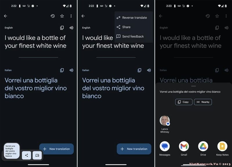 Bạn có thể làm tương tự từ điện thoại Android. Nhấn vào biểu tượng Sao chép ở đầu màn hình để sao chép bản dịch. Nếu không, bạn có thể nhấn vào biểu tượng ba chấm ở trên cùng và chọn Chia sẻ để sao chép văn bản hoặc gửi qua Chia sẻ lân cận.