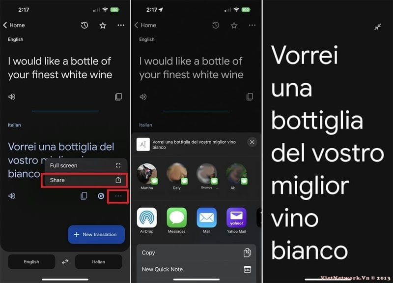 Google Dịch cho phép bạn chia sẻ bản dịch của mình với người khác. Trên iPhone, chạm vào biểu tượng dấu chấm lửng rồi chọn Chia sẻ để chia sẻ bản dịch với người khác. Từ cùng một menu, chạm vào Toàn màn hình để xem bản dịch toàn màn hình. Nhấn vào biểu tượng Sao chép để sao chép và dán vào nơi khác.
