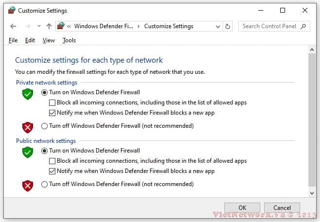 Bước 4. Kiểm tra Bật tường lửa bảo vệ Windows trong cả cài đặt mạng riêng và cài đặt mạng công cộng.