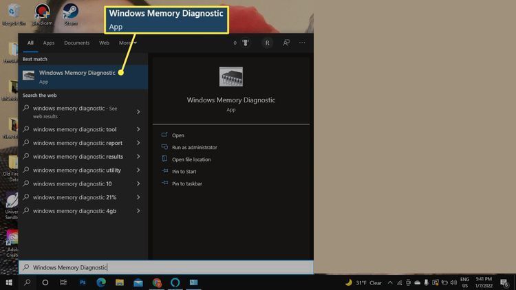 Mở công cụ tìm kiếm trên thanh tác vụ, nhập Windows Memory Diagnostic, sau đó chọn ứng dụng để mở.