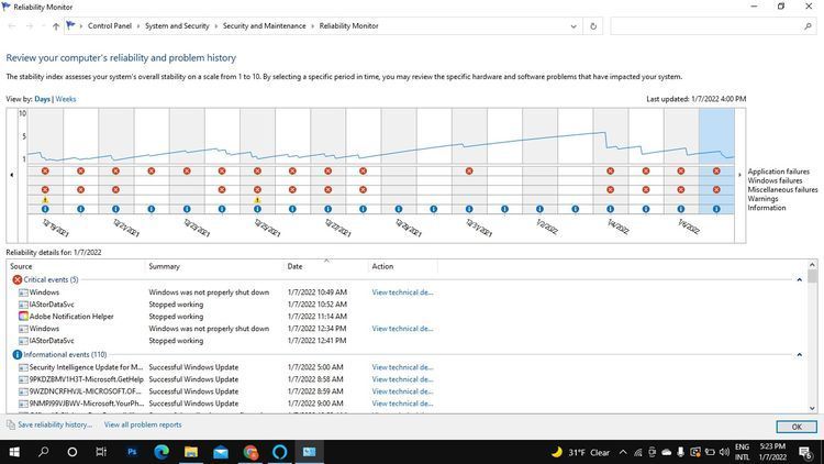 Performance Monitor và Reliability Monitor là một phần của Windows/Công cụ quản trị. Tìm kiếm Performance Monitor hoặc View reliability history và mở ứng dụng để xem số liệu thống kê về cách máy tính của bạn đang chạy. Reliability Monitor lưu nhật ký các sự kiện có thể giúp bạn xác định chương trình nào đang hoạt động không bình thường.