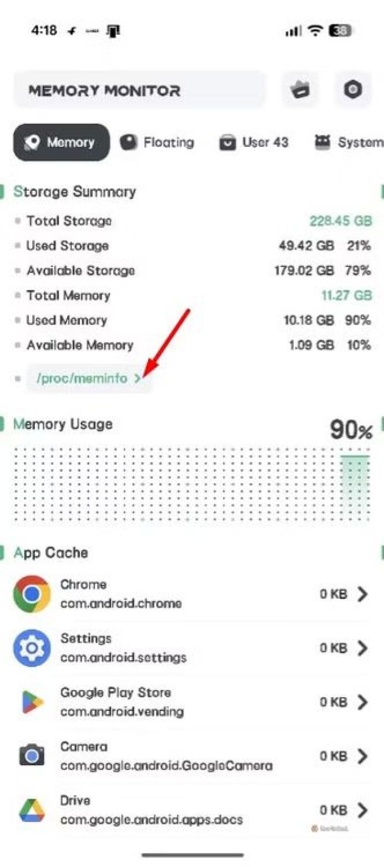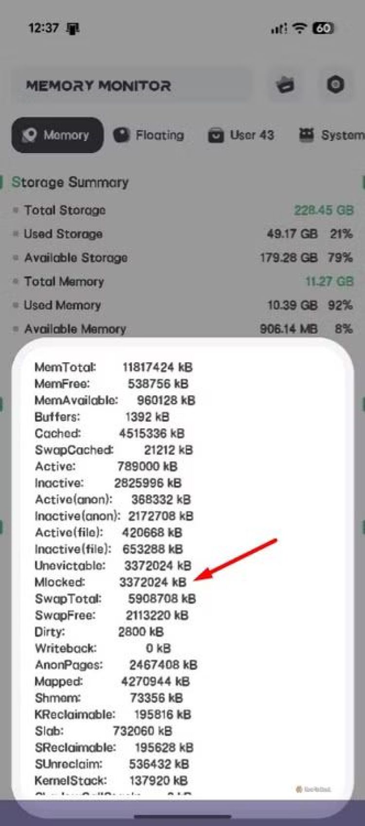 Bạn có thể kiểm tra dung lượng RAM chính xác mà Google đã khóa cho các tính năng AI trên Google Pixel 10 bằng cách tải xuống ứng dụng giám sát RAM. Tôi khuyên bạn nên sử dụng RAM Memory Monitor. Sau khi cài đặt, hãy mở ứng dụng và nhấn nút "/proc/meminfo" trong tab "Bộ nhớ". Mục Mlocked hiển thị dung lượng RAM đang bị khóa trên thiết bị của bạn. Trong trường hợp của tôi, con số này là 3.372.024 kB.