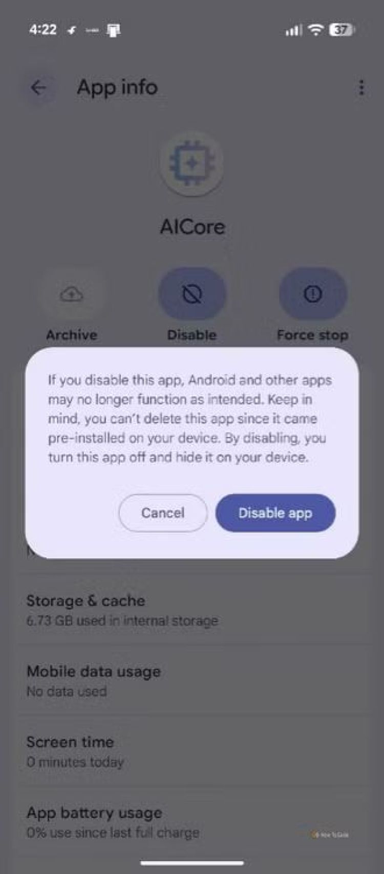 Tuy nhiên, để tắt dịch vụ AICore, hãy mở ứng dụng Cài đặt trên điện thoại thông minh Pixel của bạn và chọn Ứng dụng > Xem tất cả ứng dụng > AICore. Nhấn vào tùy chọn "Tắt", sau đó chọn "Tắt ứng dụng" từ cửa sổ bật lên xuất hiện.