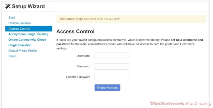 Bây giờ, bạn sẽ cần thiết lập Kiểm soát truy cập (bước này là bắt buộc). Nhập tên người dùng và mật khẩu mạnh, sau đó nhấp vào "Tạo tài khoản".