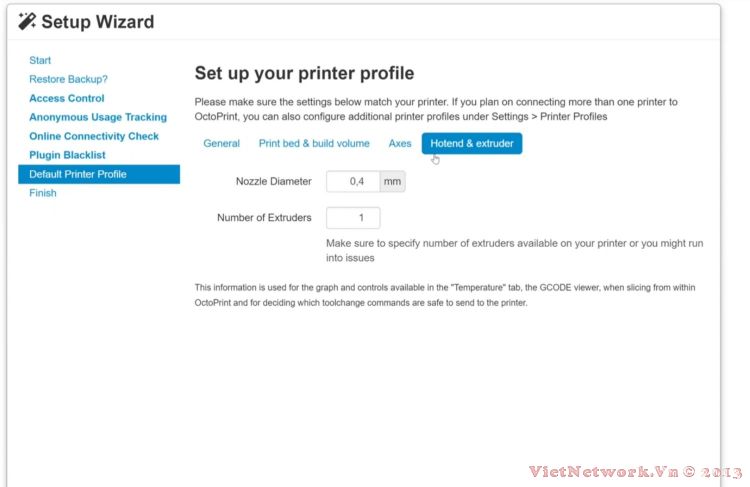 Cuối cùng, tạo hồ sơ máy in cho OctoPrint. Bạn sẽ cần tham khảo tài liệu của máy in 3D để biết thông tin này. Bạn cũng nên kiểm tra trang cộng đồng OctoPrint để xác nhận tính tương thích.