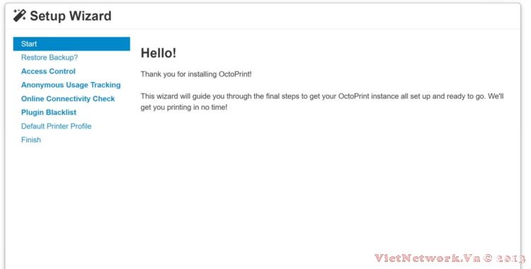 Khi đăng nhập lần đầu, bạn sẽ được chào đón bởi trình hướng dẫn chạy lần đầu. Trang đầu tiên chào mừng bạn đến với OctoPrint; nhấp vào "Tiếp theo" để tiếp tục. Sau đó, bạn sẽ được hỏi xem bạn có muốn khôi phục từ bản sao lưu hay không. Nếu bạn có, hãy tải nó lên bằng nút "Tải lên & Khôi phục". Sau khi hoàn tất hoặc nếu bạn không có bản sao lưu, hãy nhấp vào "Tiếp theo" để tiếp tục.