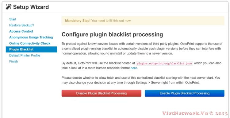 Sau đó, Trình hướng dẫn cài đặt sẽ nhắc bạn định cấu hình xử lý danh sách đen plugin. Tính năng này giúp bảo vệ khỏi các plugin có khả năng gây hại của bên thứ ba và được khuyến nghị để bảo mật.