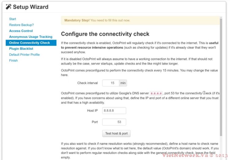 Tiếp theo, định cấu hình kết nối trực tuyến cho OctoPrint. Điều này đảm bảo rằng OctoPrint duy trì kết nối internet ổn định.
