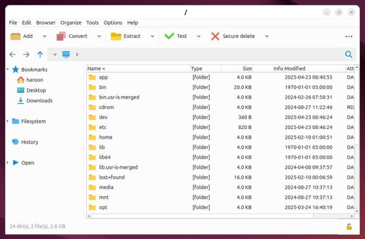 Nếu có một trình quản lý lưu trữ thực sự vượt trội, thì đó chính là PeaZip. Điều khiến PeaZip nổi bật là khả năng hỗ trợ định dạng rộng rãi. Nó có thể mở và trích xuất các tệp từ hơn 200 định dạng, bao gồm ZIP, RAR, 7Z, TAR và định dạng PEA gốc của nó—viết tắt của Pack, Encrypt, Authenticate, trong trường hợp bạn tò mò. Và nó không chỉ dành cho Linux; nó còn hoạt động trên Windows và macOS, rất tiện lợi nếu bạn chuyển đổi giữa các hệ thống.