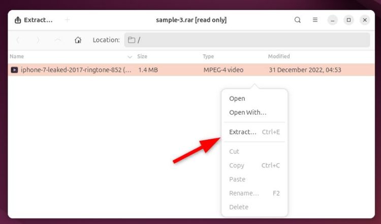 Để giải nén tệp RAR bằng File Roller, hãy mở ứng dụng, điều hướng đến tệp RAR của bạn, nhấp chuột phải vào tệp đó và chọn Giải nén.