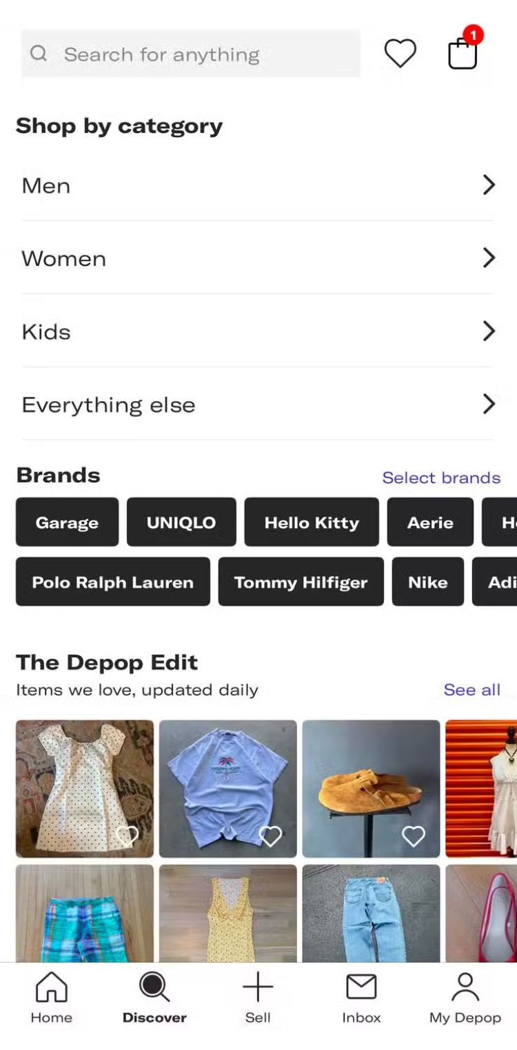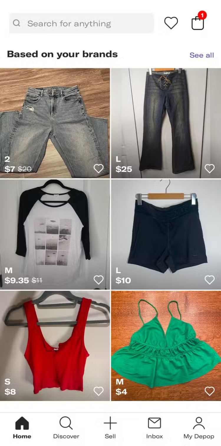 Đây là ứng dụng mua và bán lại, nơi bạn có thể tìm thấy một số món đồ tiết kiệm độc đáo và bán quần áo và phụ kiện mà bạn không còn sử dụng nữa. Sau khi thiết lập tài khoản, thêm kích cỡ và chọn thương hiệu bạn quan tâm, Depop sẽ đưa ra cho bạn các đề xuất và cho phép bạn khám phá các thương hiệu, danh mục và kiểu dáng mới.
