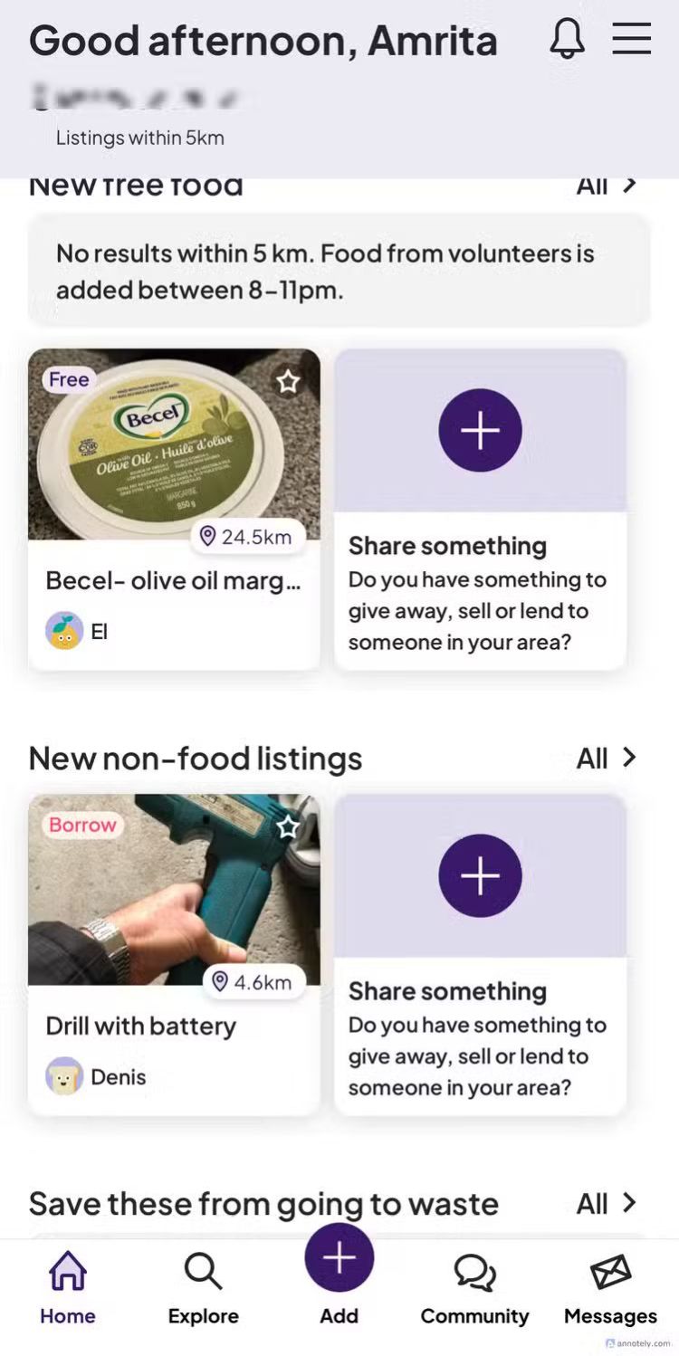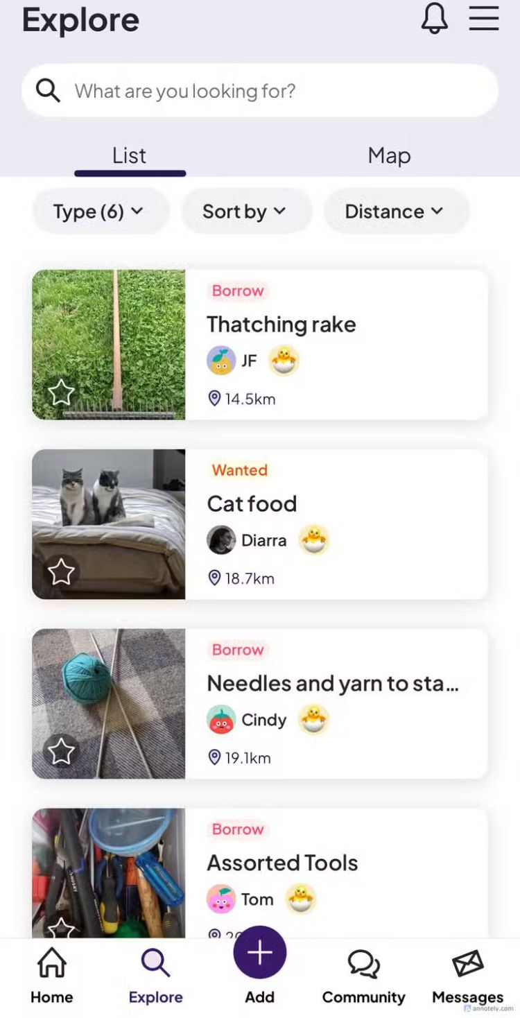 Khi bạn bắt đầu sử dụng ứng dụng, bạn sẽ có thể xem các thành viên cộng đồng gần vị trí của bạn và những gì họ đang yêu cầu, bán hoặc tặng. Tôi thường tìm thấy các công cụ tạm thời hoặc sử dụng một lần, chẳng hạn như máy khoan và xẻng, từ các thành viên cộng đồng trên ứng dụng này và vì các mặt hàng có thể được mượn, tôi chưa bao giờ phải trả bất kỳ khoản phí bổ sung nào khi trao đổi. Sau khi bạn nhắn tin cho một thành viên, bạn có thể sắp xếp để họ đến lấy tại nhà của họ (hoặc thậm chí là một không gian công cộng để đảm bảo an toàn). Olio gợi nhớ đến Facebook Marketplace về mặt giao dịch, nhưng điều khiến ứng dụng này tốt hơn là các tùy chọn cho mượn/cho mượn.