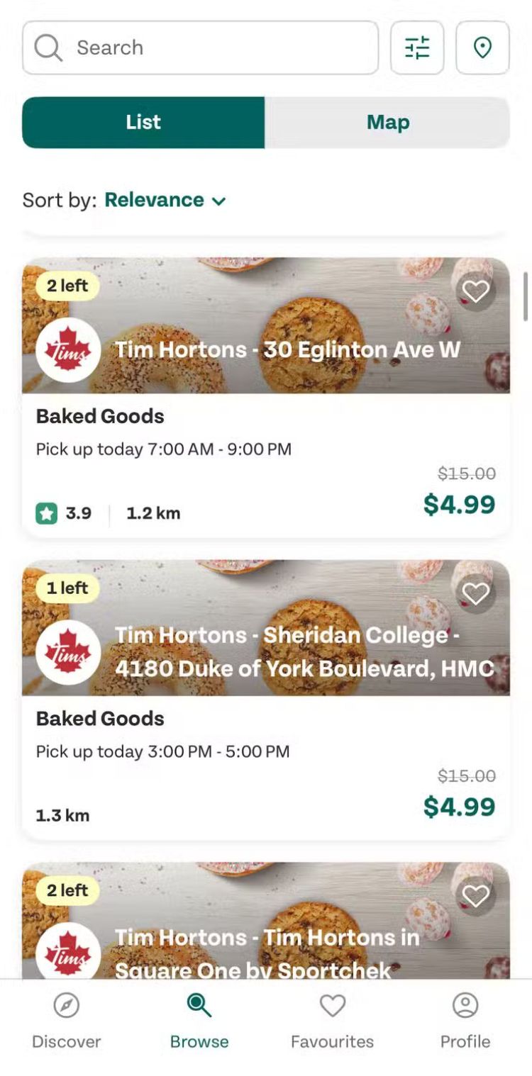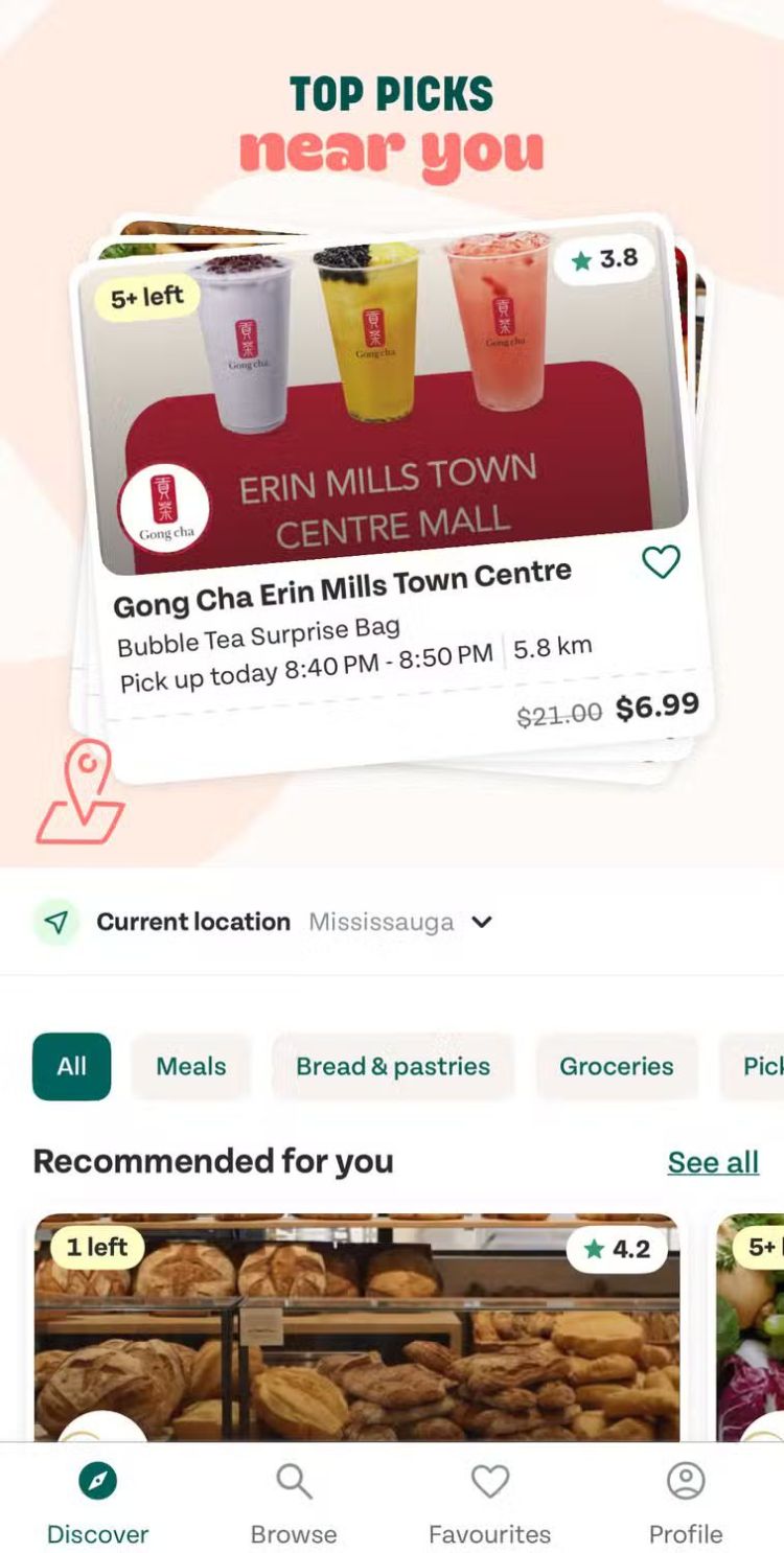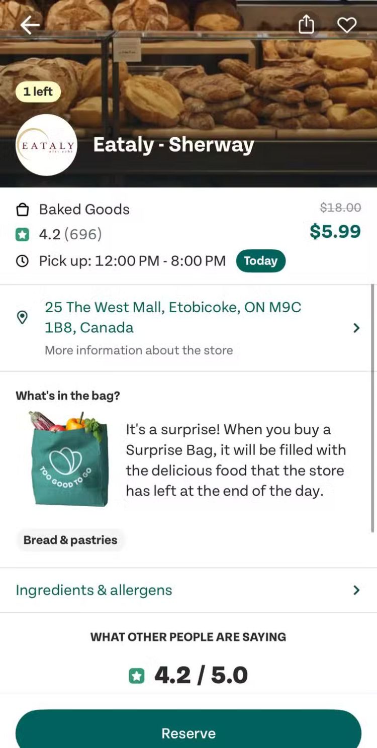 Too Good to Go có rất nhiều mặt hàng bánh nướng (mặc dù điều này có thể phụ thuộc vào nơi bạn sống): ví dụ, tôi thường mua một túi bánh nướng bất ngờ của Tim Horton, giá thông thường là 15 đô la, nhưng chỉ với 4,99 đô la. Bạn có thể theo dõi số tiền mình đã tiết kiệm được và lượng CO2 được bảo tồn thông qua các lần mua hàng trên ứng dụng.