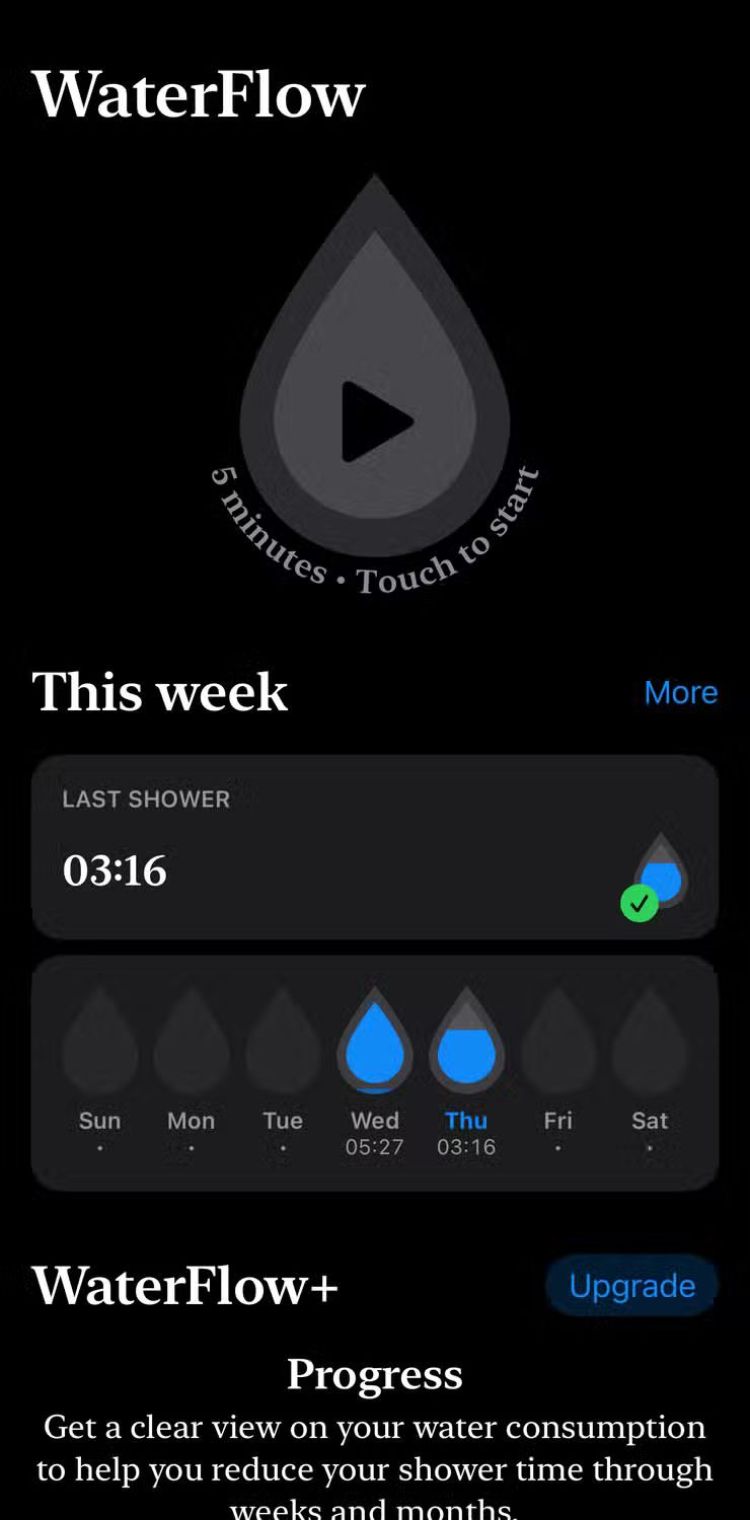 WaterFlow là một ứng dụng phục vụ cho một mục đích cụ thể: theo dõi thời gian tắm của bạn và ước tính xem bạn có nằm trong thời gian khuyến nghị là 5 phút cho mỗi lần tắm hay không. Bạn có thể tự tay đặt bộ hẹn giờ tắm và dừng khi bạn tắm xong hoặc nếu bạn mang theo điện thoại khi tắm, hãy sử dụng micrô của ứng dụng để tự động theo dõi số phút tắm.