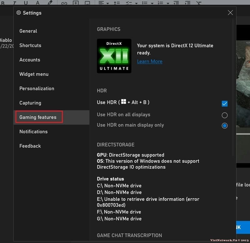 Bạn có thể kiểm tra xem hệ thống của mình có đáp ứng các yêu cầu này hay không bằng cách mở Xbox Game Bar. Nhấn Windows Key + G để mở lớp phủ, sau đó nhấp vào biểu tượng bánh răng Cài đặt. Chọn tab Tính năng trò chơi ở bên trái để xem phiên bản Windows, GPU và ổ đĩa của bạn có sẵn sàng DirectStorage hay không.