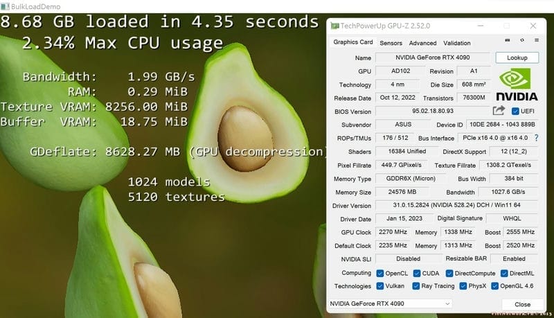 DirectStorage khắc phục vấn đề này bằng cách chuyển tất cả dữ liệu dày đặc đó trực tiếp đến GPU. Điều này về cơ bản hợp lý hóa toàn bộ quy trình bằng cách cho phép dữ liệu không nén được hiển thị ngay lập tức, thay vì phải đợi dữ liệu chuyển từ quy trình sang cạc đồ họa. Kết quả là tốc độ truyền dữ liệu nhanh hơn và CPU được giải phóng để tập trung vào các tác vụ khác.