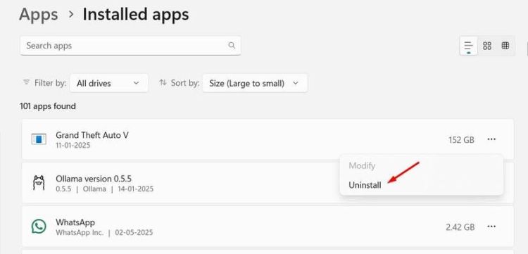 Sau đó, tôi đề xuất thay đổi menu thả xuống Sắp xếp theo thành "Kích thước (Lớn đến Nhỏ)". Điều này sẽ giúp bạn nhanh chóng xác định các ứng dụng lớn. Nhấp vào ba dấu chấm bên cạnh ứng dụng bạn muốn xóa và chọn "Gỡ cài đặt" từ menu thả xuống.