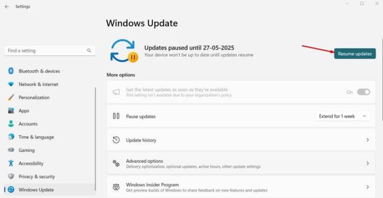 Theo mặc định, Windows 11 được thiết lập để tự động kiểm tra các bản cập nhật khi bạn kết nối Internet. Tuy nhiên, điều này sẽ không xảy ra nếu bạn cố ý hoặc vô tình tạm dừng Windows Update. Để kiểm tra điều này, hãy mở ứng dụng Cài đặt và chọn "Windows Update" từ thanh bên trái. Nếu Windows Update bị tạm dừng, bạn sẽ thấy nút "Tiếp tục cập nhật" thay vì nút "Kiểm tra cập nhật". Nhấp vào nút đó để bắt đầu nhận lại các bản cập nhật Windows.