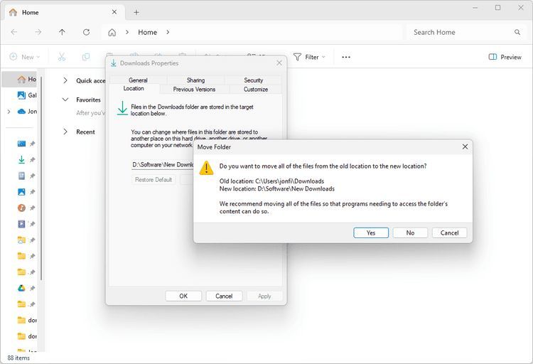 Chọn Có hoặc Không khi được nhắc để di chuyển tất cả các tệp ra khỏi vị trí tải xuống cũ vào thư mục mới.