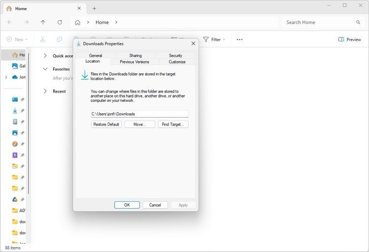 Cách dễ nhất để thay đổi thư mục tải xuống mặc định là chỉnh sửa vị trí trong menu Thuộc tính của thư mục Tải xuống.