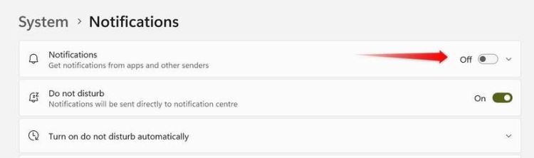 Để tắt tất cả thông báo, hãy mở ứng dụng Cài đặt, đi đến tab "Hệ thống" ở bên trái và đi đến "Thông báo". Sau đó, tắt công tắc bên cạnh "Thông báo". Thao tác này sẽ vô hiệu hóa cảnh báo từ tất cả các ứng dụng trên toàn hệ thống của bạn. Chỉ cần bật lại thông báo sau khi hoàn tất để bạn không bỏ lỡ bất kỳ bản cập nhật quan trọng nào sau này.