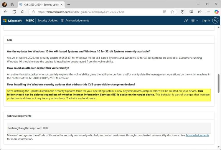 Microsoft đã xác nhận rằng việc tạo thư mục "inetpub" là cố ý và liên quan đến bản cập nhật bảo mật giải quyết lỗ hổng trong dịch vụ Windows Process Activation Elevation, được xác định là CVE-2025-21204.