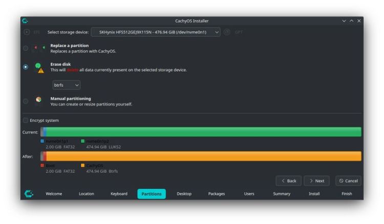 Sẽ không lâu nữa trước khi bạn đến với lựa chọn lớn tiếp theo: hệ thống tệp. CachyOS đề xuất Btrfs làm mặc định, nhưng EXT4 là một lựa chọn tốt khác, mặc dù không phải là lựa chọn duy nhất của bạn. Bạn cũng có thể chọn XFS, ZFS hoặc thậm chí là F2FS hoặc "Hệ thống tệp thân thiện với Flash" chuyên biệt hơn, chỉ thực sự hữu ích nếu bạn đang cài đặt CachyOS trên ổ USB chẳng hạn.