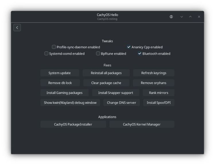 Bản phân phối này bao gồm các công cụ như ứng dụng Cachy Hello để quản lý gói dễ dàng và có thể cài đặt các gói trò chơi phổ biến chỉ bằng vài cú nhấp chuột.