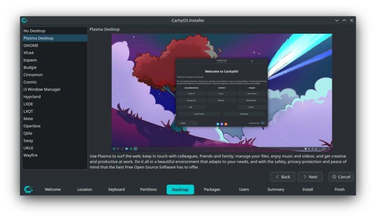 Cuối cùng, trong khi Endeavour và Garuda đều không được biết đến vì thiếu tùy chọn máy tính để bàn, trình cài đặt của CachyOS cung cấp một số lượng đáng kinh ngạc. Ngoài các tùy chọn KDE Plasma và Gnome mặc định, bạn có các tùy chọn ít phổ biến hơn như Cosmic, bspwm, UKUI và Wayfire, cùng nhiều tùy chọn khác.