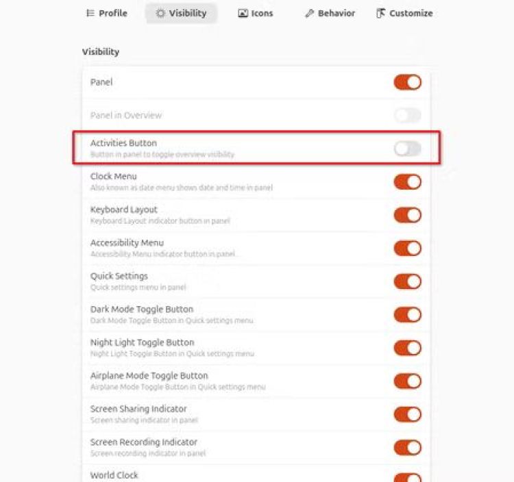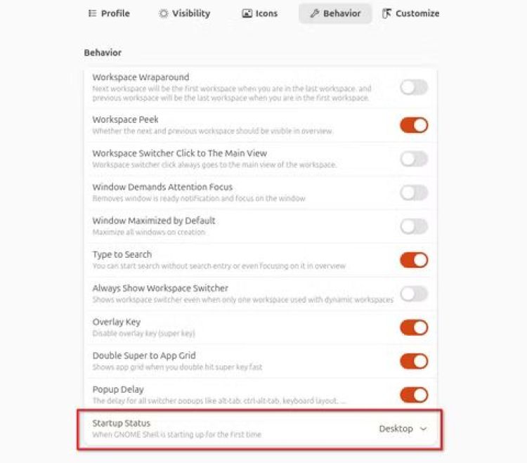 Tiếp theo, tôi vào tab Hành vi (Behavior) và đổi trạng thái khởi động từ "Tổng quan" thành "Màn hình nền" (Desktop). Lý do là vì tôi thích khởi động thẳng vào màn hình nền và không muốn thấy màn hình Tổng quan. Tôi cũng tắt nút Hoạt động (Activity) vì cảm thấy nó thừa thãi so với các tiện ích mở rộng khác tôi đang sử dụng.