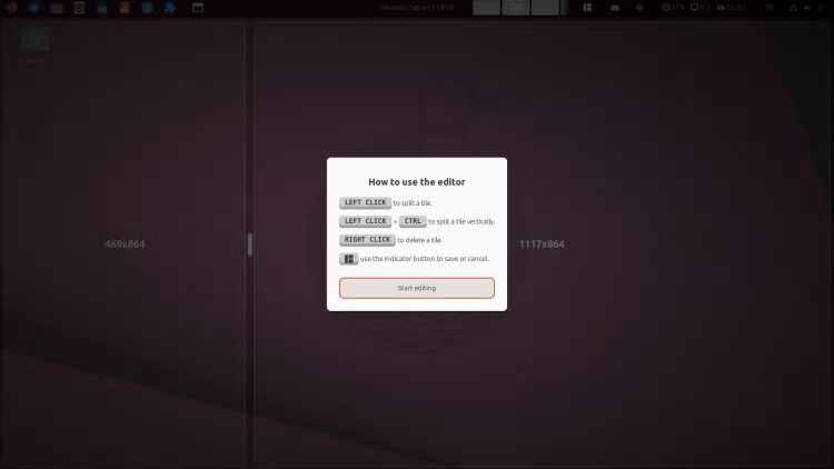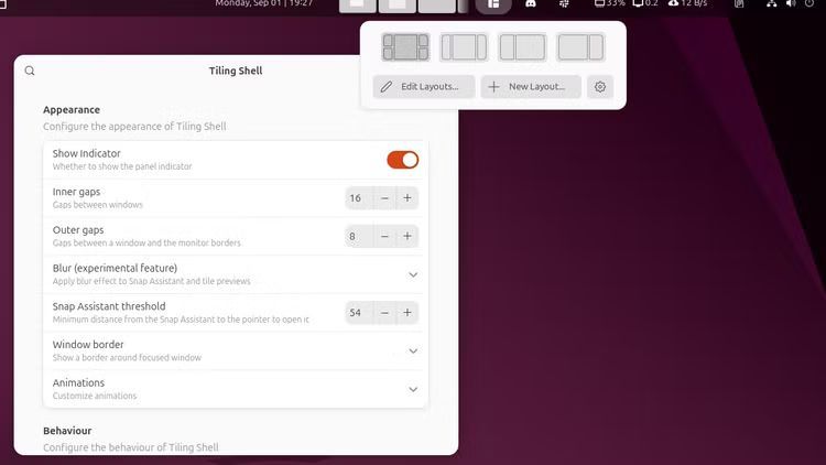 GNOME có một số tiện ích mở rộng sắp xếp ô vuông mạnh mẽ, nhưng Tiling Shell là tiện ích yêu thích của tôi. Nó thực sự là một công cụ tăng cường năng suất, đặc biệt nếu bạn đang sử dụng màn hình siêu rộng và cần sắp xếp nhiều cửa sổ gọn gàng. Tiện ích mở rộng này bổ sung một bảng điều khiển nhỏ hiển thị các tùy chọn bố cục khác nhau khi nhấp vào. Bạn có thể tạo bố cục tùy chỉnh với khả năng kiểm soát chi tiết kích thước và vị trí vùng, xác định chính xác số lượng vùng bạn muốn và kích thước của mỗi vùng.