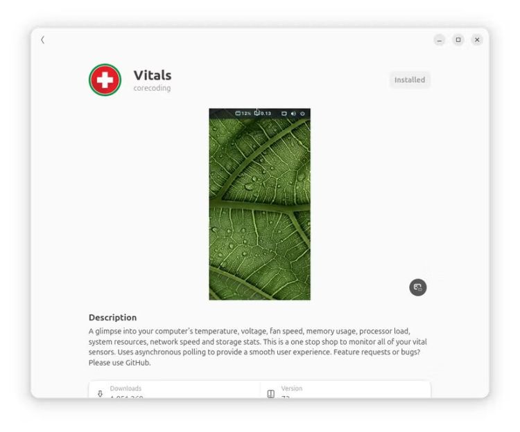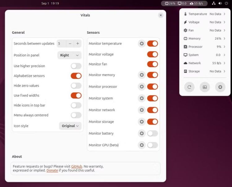 Việc hiển thị liên tục những con số này trên bảng điều khiển phía trên giúp tôi chủ động hơn về tình trạng hệ thống. Tôi không cần phải mở một ứng dụng giám sát riêng biệt hay tự hỏi điều gì đang ngốn tài nguyên - tất cả đều nằm ngay đó. Ngoài ra, khi nhấp vào chỉ báo Vitals, một chế độ xem chi tiết với các số liệu thống kê hệ thống bổ sung sẽ hiện ra. Bạn có thể vào phần cài đặt tiện ích mở rộng để tùy chỉnh cảm biến nào sẽ hiển thị, vị trí của chúng (tôi để cảm biến ở bên phải) và chu kỳ cập nhật.