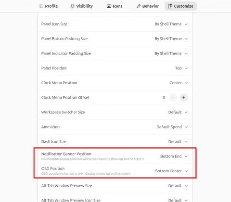 Sau đó, trong mục Tùy chỉnh, tôi di chuyển banner thông báo từ giữa trên xuống dưới vì thông báo ở đó ít gây mất tập trung hơn. Tương tự, tôi di chuyển vị trí OSD (Hiển thị trên màn hình) từ giữa xuống dưới để các thanh trượt âm lượng hoặc độ sáng không làm lộn xộn không gian làm việc chính. Tôi giữ nguyên mọi thứ khác ở cài đặt mặc định, nhưng bạn có thể sử dụng tiện ích mở rộng để điều chỉnh kích thước bảng điều khiển, kích thước biểu tượng, khoảng đệm - về cơ bản là mọi thứ giúp GNOME trông giống như máy tính để bàn của bạn.