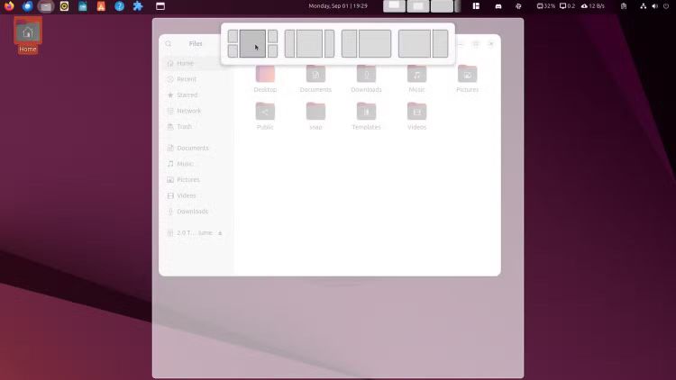 Bây giờ, thay vì sử dụng chỉ báo bảng điều khiển, bạn cũng có thể kéo cửa sổ lên cạnh trên cùng của màn hình để mở trình chọn bố cục và chọn một vùng để xếp chồng cửa sổ. Ngoài ra, bạn có thể giữ phím Ctrl trong khi di chuyển cửa sổ để kích hoạt lớp phủ bố cục mặc định và xếp chồng cửa sổ vào một vùng cụ thể.