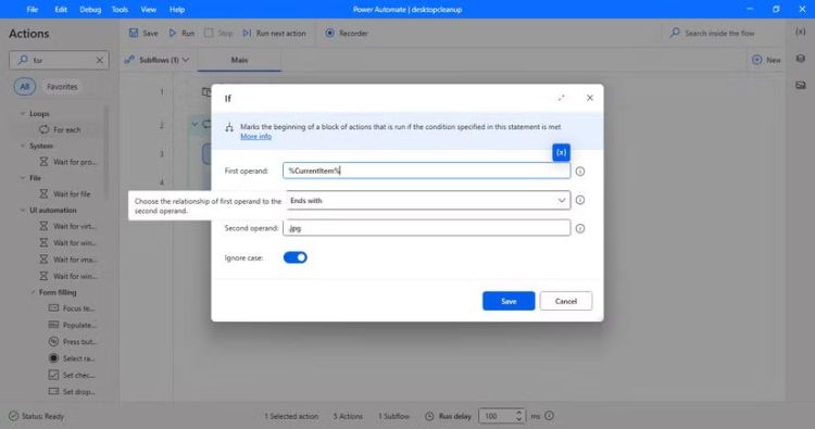 Bây giờ, chúng ta muốn yêu cầu Power Automate xem xét tất cả các tệp trên màn hình nền và chọn đúng tệp. Chúng ta có thể làm như vậy bằng cách yêu cầu nó ghi chú phần mở rộng. Ví dụ: một tệp hình ảnh sẽ có phần mở rộng .jpg, .jpeg, .png hoặc .webp ở cuối. Vì vậy, đối với toán tử, chúng ta chọn "Kết thúc bằng".