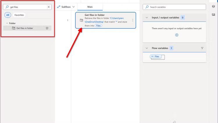 Bạn sẽ thấy hành động đầu tiên hiện đang nằm trong luồng chính, lưu trữ kết quả đầu ra trong biến "Files". Truy xuất tệp là bước đầu tiên. Bước tiếp theo là định tuyến lại các tệp đến các thư mục liên quan. Hãy cùng thực hiện ngay bây giờ.