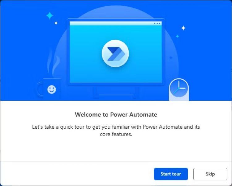 Trước tiên, hãy làm quen với Power Automate. Mở menu Bắt đầu, tìm kiếm power automate và khởi chạy ứng dụng. Trong lần khởi động đầu tiên, ứng dụng sẽ chào đón bạn bằng màn hình chào mừng, bạn có thể bỏ qua nếu muốn. Giờ thì bạn đã ở trên bảng điều khiển.