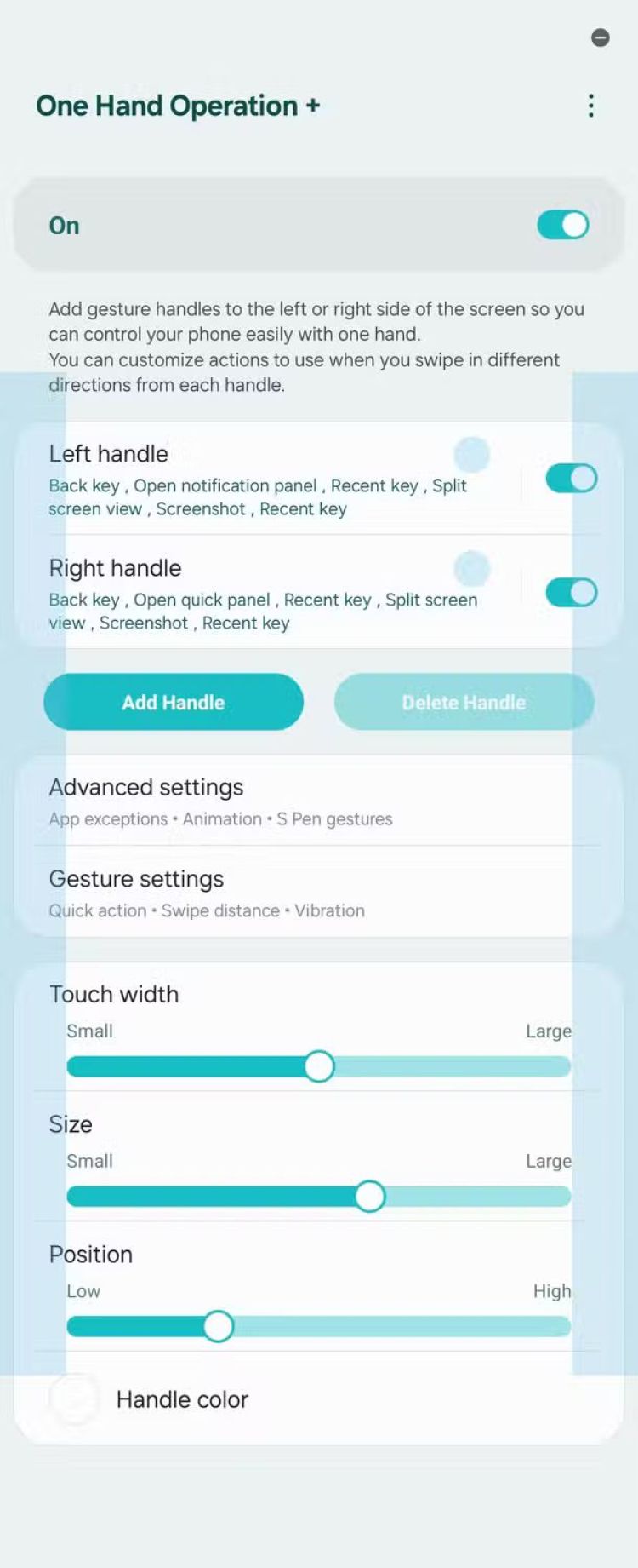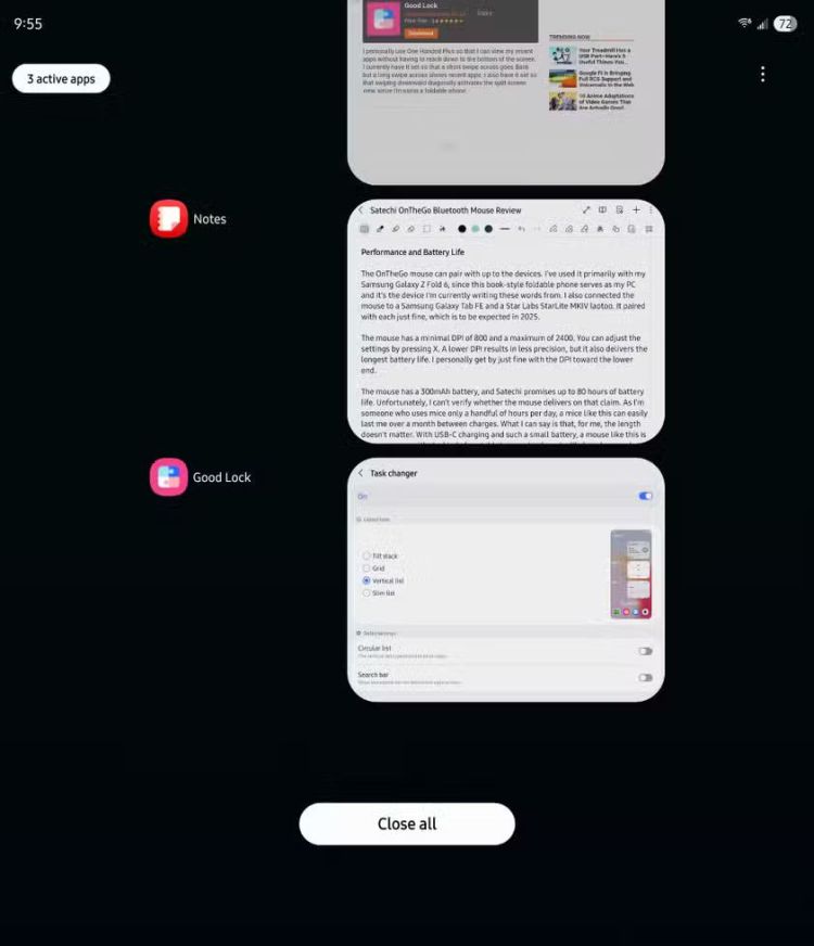 "One Hand Operation +" là tiện ích bổ sung yêu thích nhất của tôi trên Good Lock. Nó cho phép tôi thay đổi thao tác vuốt từ cạnh màn hình vào. Thay vì chỉ một thao tác đơn giản đưa tôi trở lại màn hình trước đó, tôi có thể thực hiện thao tác vuốt dài hơn để bật chế độ đa nhiệm chia màn hình, điều mà tôi thường xuyên làm trên chiếc điện thoại gập kiểu sách của mình. Tôi đã cấu hình thao tác vuốt xuống theo đường chéo để hiển thị các ứng dụng gần đây, tôi thấy thao tác này nhanh hơn nhiều so với thao tác mặc định là vuốt lên và giữ từ dưới màn hình. Vì tôi chụp rất nhiều ảnh màn hình, nên tôi đã thiết lập thao tác vuốt lên theo đường chéo để chụp ảnh màn hình, giúp tôi không phải vặn vẹo tay để giữ đồng thời nút nguồn và nút tăng giảm âm lượng.