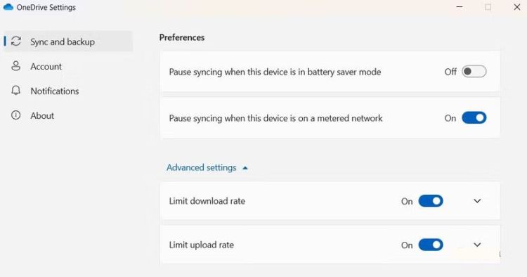 Cuối cùng, tôi khuyên bạn nên giới hạn tốc độ tải xuống và tải lên của OneDrive. Việc không giới hạn dung lượng sử dụng internet của OneDrive không chỉ tiêu tốn nhiều băng thông hơn mà còn ảnh hưởng đến hiệu suất tổng thể của hệ thống. Để giới hạn mức sử dụng internet của OneDrive, hãy vào Cài đặt OneDrive, chọn "Đồng bộ hóa và Sao lưu" từ thanh bên trái, rồi nhấp vào menu thả xuống "Cài đặt Nâng cao" ở bên phải. Bật nút chuyển đổi bên cạnh "Giới hạn Tốc độ Tải xuống" và "Giới hạn Tốc độ Tải lên", sau đó nhập tốc độ bạn muốn phân bổ cho từng mục vào các trường tương ứng.