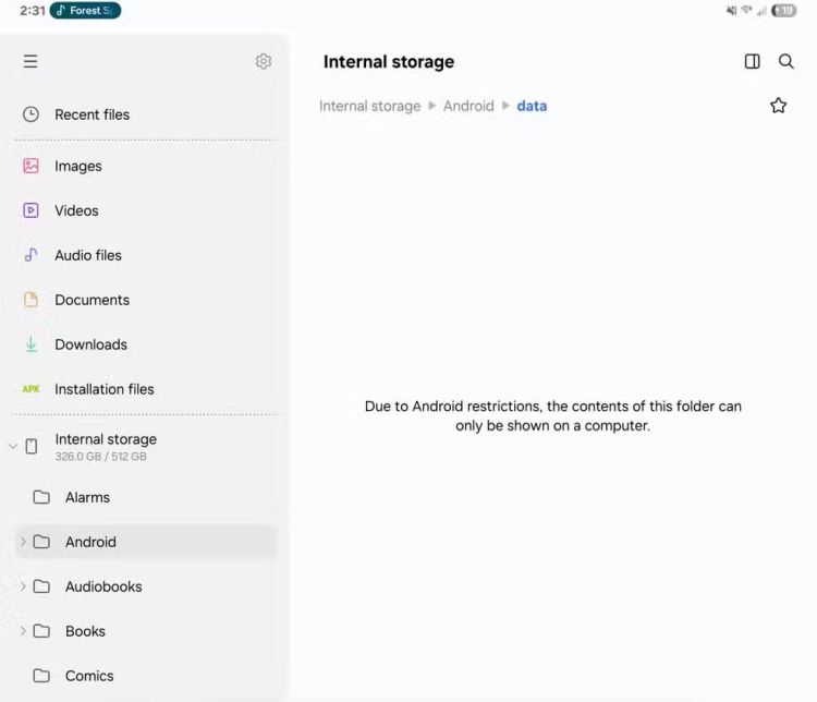 Điều này đôi khi đúng trên Android, nhưng không phải hầu hết thời gian. Thỉnh thoảng tôi đã thành công khi tìm kiếm qua các thư mục Android > Dữ liệu nằm trong bộ nhớ trong, nhưng không phải hầu hết thời gian và các thư mục này ngày càng khó truy cập. Galaxy Z Fold 6 của tôi yêu cầu tôi cắm điện thoại vào PC để truy cập các tệp này, điều này rất khó khi điện thoại của tôi là PC.