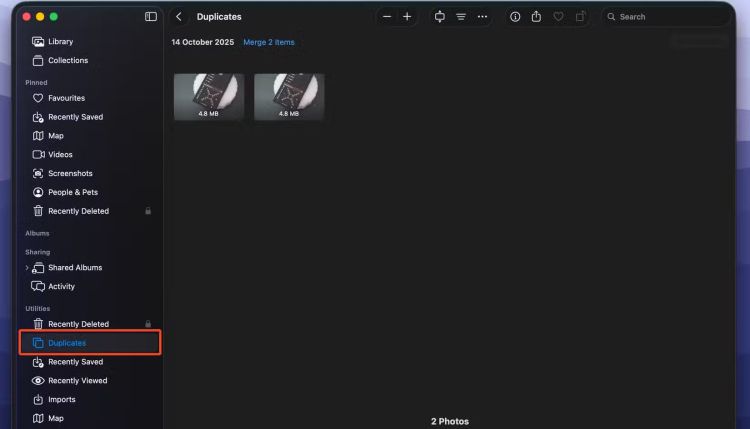 Mở Ảnh và tìm mục "Tiện ích" trong thanh bên. Nếu bạn có bất kỳ ảnh trùng lặp nào trong thư viện, bạn sẽ thấy mục "Trùng lặp" ở đây. Chọn mục đó và xóa một trong mỗi bản sao.