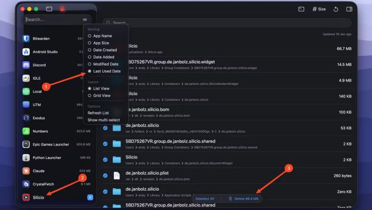 Cài đặt và mở Pearcleaner. Trong hộp Tìm kiếm, nhấp vào nút menu hamburger (ba dòng ngang) và thay đổi mục Sắp xếp thành "Ngày sử dụng gần nhất". Cuộn xuống dưới cùng để xem các ứng dụng bạn ít sử dụng nhất. Nếu bạn không còn cần ứng dụng đó nữa, hãy chọn ứng dụng đó và nhấn "Xóa" ở cuối khung bên phải.