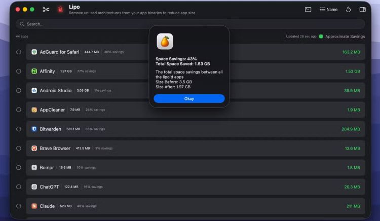 Vào Xem > Điều hướng đến > Ứng dụng Lipo. Bạn sẽ thấy danh sách tất cả các ứng dụng có kiến trúc không cần thiết, cùng với mức tiết kiệm ước tính nếu bạn xóa chúng. Chọn một ứng dụng và chọn "Khởi động Lipo". Quá trình này không hoàn toàn an toàn và các ước tính không phải lúc nào cũng chính xác, vì vậy hãy thử từng ứng dụng một và kiểm tra xem chúng vẫn hoạt động sau khi bạn hoàn tất.