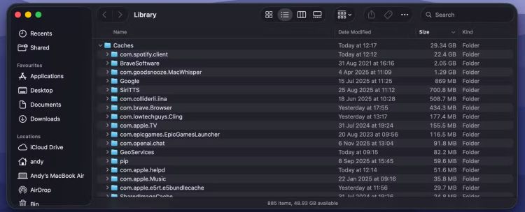 Để tìm bộ nhớ đệm thủ công trong Finder, hãy vào Go, sau đó giữ phím Option và chọn "Library". Tìm thư mục Cache và sắp xếp theo kích thước để xem những thư mục lớn nhất. Sau đó, bạn có thể kiểm tra ứng dụng xem có cài đặt "Clear Cache" (Xóa bộ nhớ đệm) hay chỉ cần xóa thư mục khỏi đây.