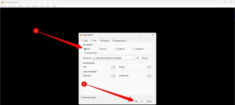 VLC cung cấp cho bạn một cửa sổ Open Media cho phép bạn tinh chỉnh những thứ như nơi bắt đầu phát lại hoặc bản nhạc âm thanh hoặc phụ đề nào bạn sử dụng. Tôi khuyên bạn nên giữ nguyên cài đặt mặc định. Đảm bảo rằng DVD được chọn ở trên cùng, sau đó nhấp vào "Phát".