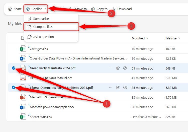 Trong ví dụ này, giả sử bạn muốn so sánh các bản tuyên ngôn của hai đảng phái chính trị mà bạn đã tải xuống ở định dạng PDF và lưu vào OneDrive của mình. Trước tiên, hãy chọn các tệp bằng cách kích hoạt dấu kiểm của chúng. Sau đó, nhấp vào "Copilot" trong ruy-băng dọc theo đầu cửa sổ OneDrive và chọn "So sánh tệp".