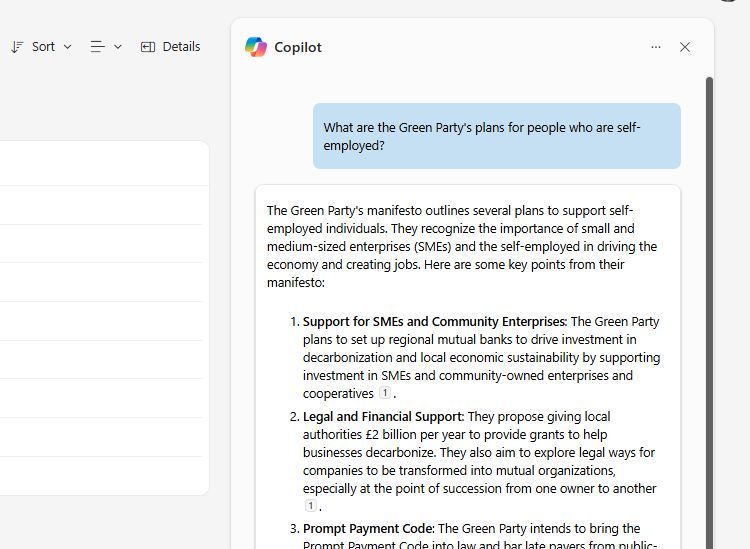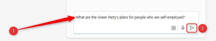 Sau đó, trong trường văn bản của thanh bên xuất hiện, hãy nhập câu hỏi của bạn và nhấp vào mũi tên "Gửi" ở góc dưới bên phải. Trong trường hợp này, bạn có thể hỏi, "Đảng Xanh có kế hoạch gì cho những người tự kinh doanh?"