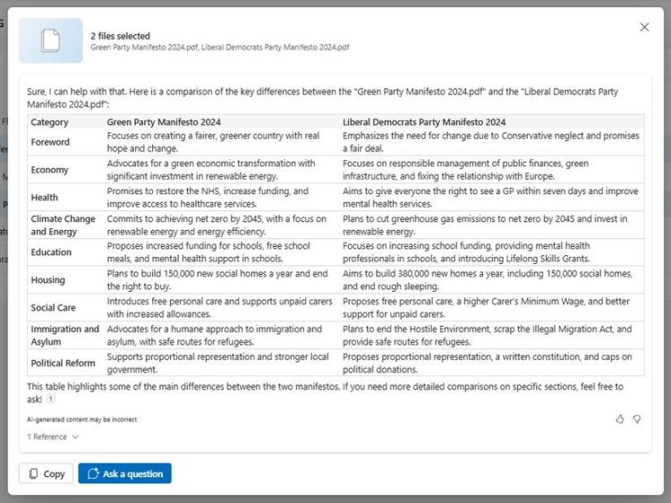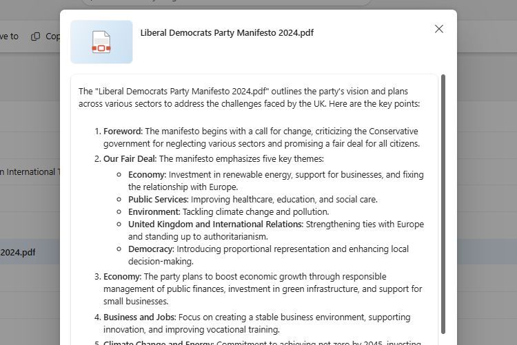 Khả năng của Copilot không chỉ giới hạn ở các tài liệu Microsoft. Trong ví dụ này, có một cuộc tổng tuyển cử sắp diễn ra ở Vương quốc Anh và bạn muốn nhanh chóng xem lại những gì Đảng Dân chủ Tự do đề xuất nếu họ thắng cử. Sau khi tải xuống bản tuyên ngôn dài ở định dạng PDF từ trang web của đảng và lưu vào OneDrive của bạn, hãy di chuột qua tệp, nhấp vào biểu tượng "Copilot" và chọn "Tóm tắt".