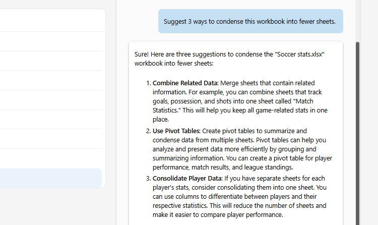 Mặt khác, một lệnh ít cụ thể hơn—như "Gợi ý cách cải thiện bảng tính này"—sẽ trả về phản hồi dài hơn nhiều với các gợi ý rộng và phức tạp hơn.